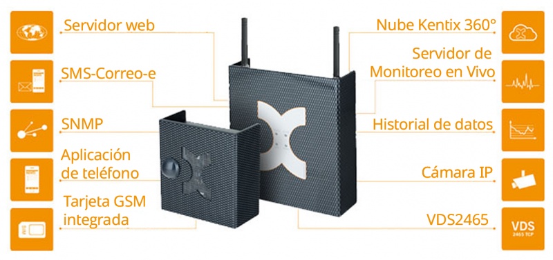 El catálogo Kentix ofrece monitoreo del entorno en diferentes tipos de dispositivos y formatos de conexión. Los multiSensor se pueden conectar mediante un cable de PoE o con 12vdc con una red ZigBee® cerrada. Usted puede monitorear los niveles ambientales y la energía eléctrica dentro de sus gabinetes de servidor con el MultiSensor-Rack, puede montar un MultiSensor en el techo de la sala de equipos para cobertura de área y puede colocar dispositivos inalámbricos en las puertas o ventanas combinando intrusiones y amenazas ambientales en un solo punto de datos. Los equipos existentes se pueden vincular al sistema Kentix con tarjetas de Entrada/Salida o terminales integrados para aumentar el valor de los dispositivos analógicos sin inteligencia, tales como ventiladores, bombas, filtros o contactos de puerta.